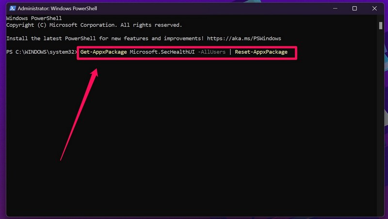 Nu, om återställning av Windows Security-appen från Windows-inställningar inte åtgärdade problemet med Windows-säkerhet som inte fungerar på din Windows 11-enhet, kanske du vill använda Powershell-verktyget i Windows för att återställa det.
