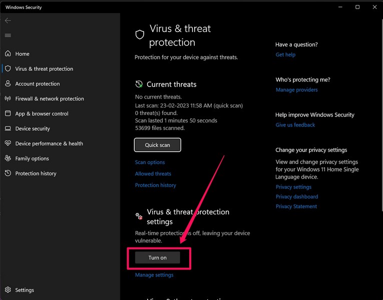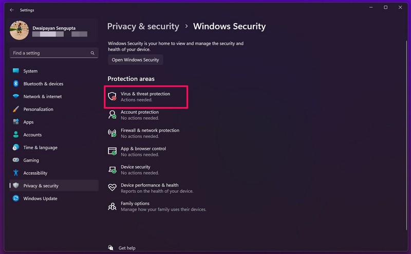 I det här fallet måste du manuellt återaktivera virus- och hotskyddsfunktionen i Windows Security-appen på din Windows 11-dator eller bärbara dator. Följ stegen till höger nedan för att manuellt aktivera Windows-säkerhet i Windows 11: