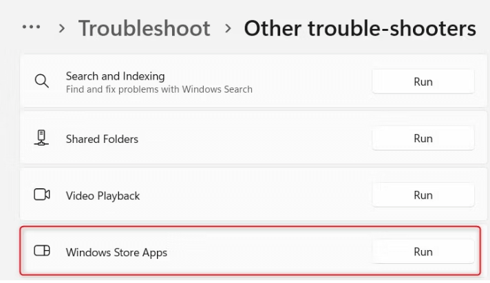 Steg 4:Leta nu efter Windows Store Apps felsökare och klicka sedan på KÖR-knappen.
