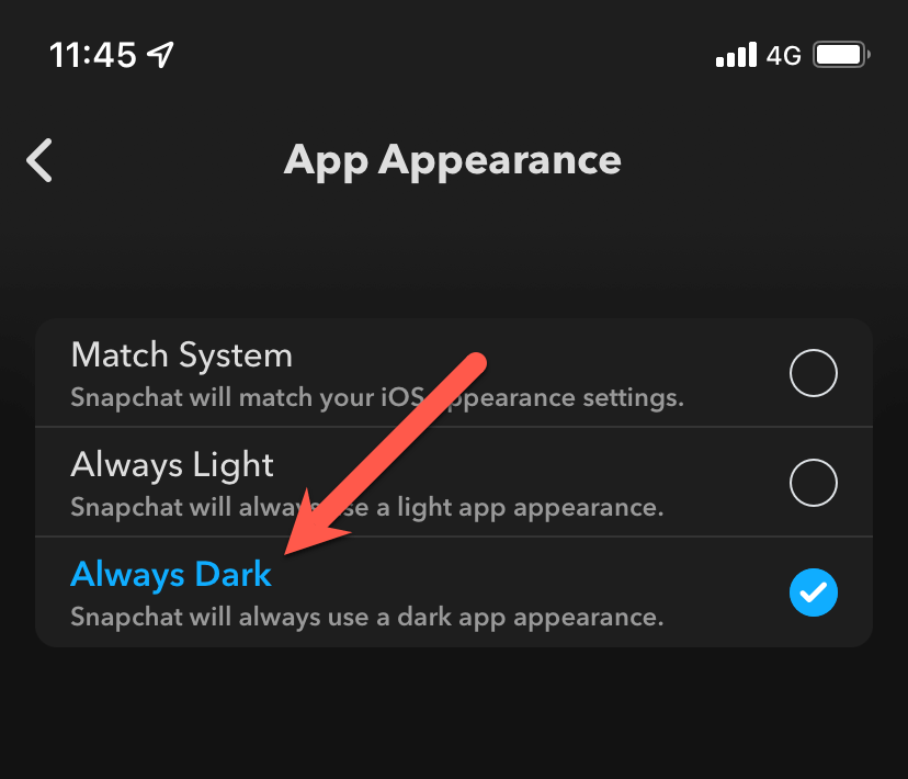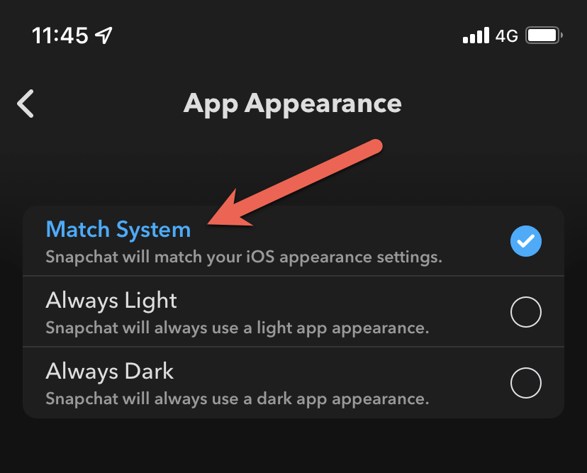Alternativt kan du konfigurera Snapchat för att matcha dess tema med systemtemat i iOS. För att göra det, väljMatchsystemalternativet på skärmen Appens utseende.