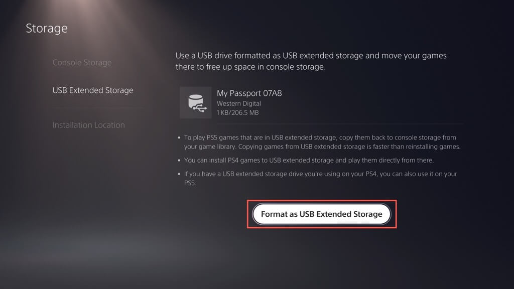 - VäljaInstallationsplatsoch ställ inPS4-spel och appartillUSB utökad lagring.