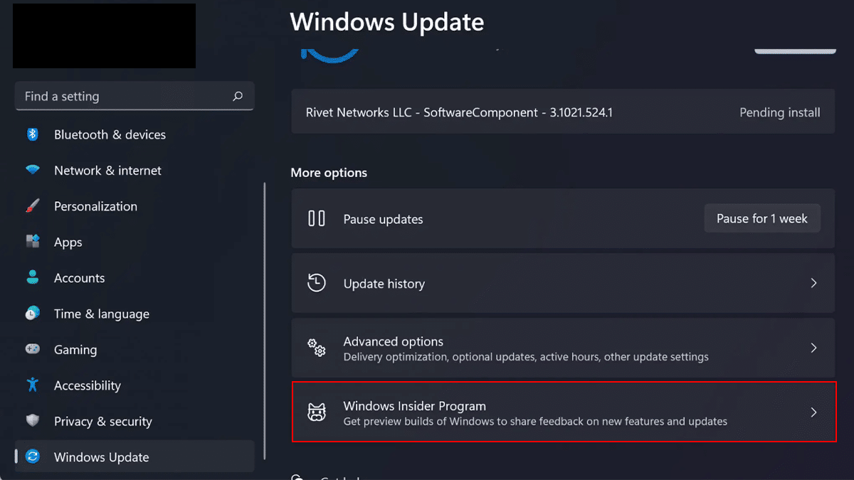 - Välj till vänsterWindows Update> klicka påWindows Insider-program.