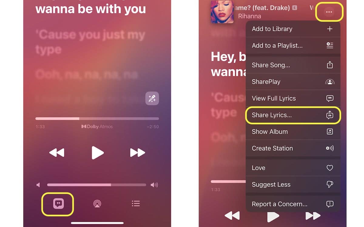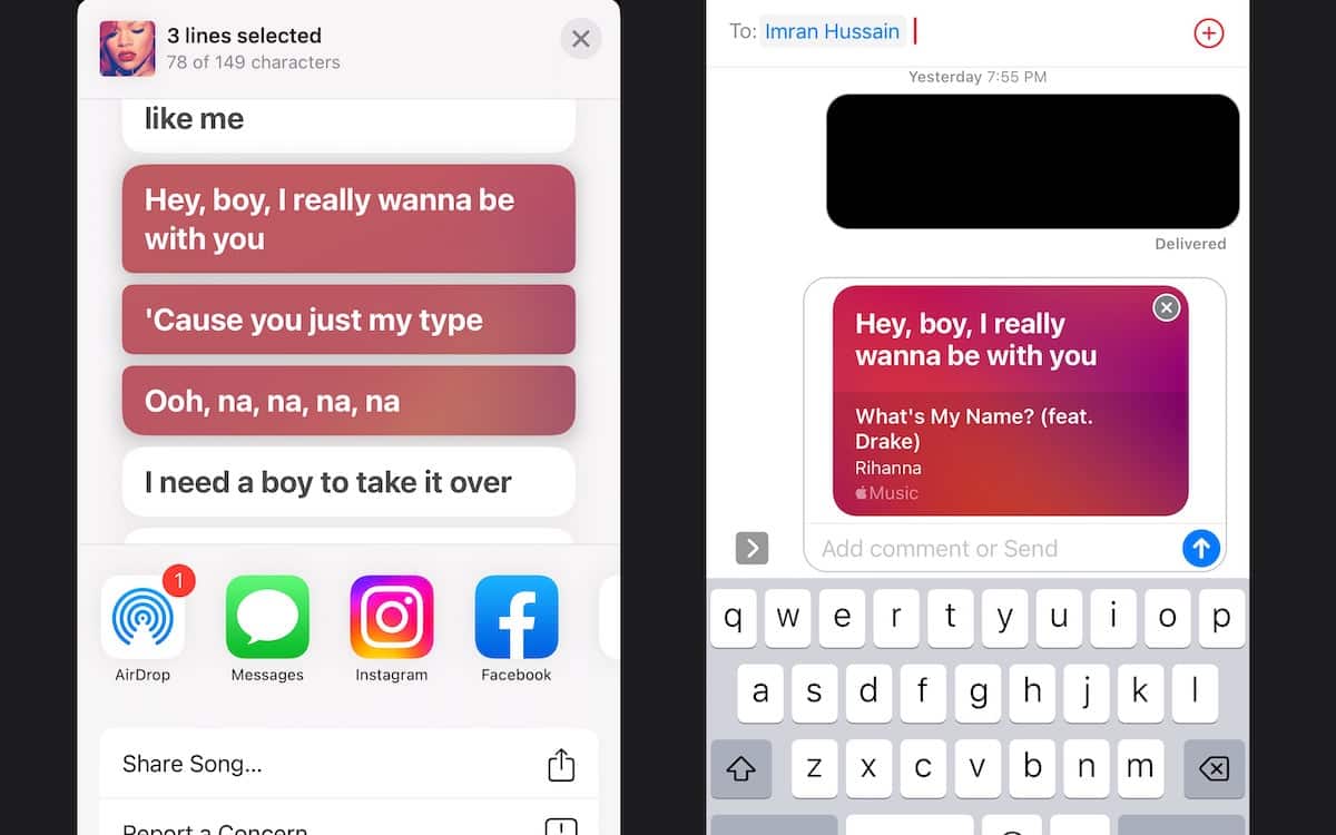 Apple Music-prenumeranter kan dela texter med andra iOS- och iPadOS-användare även om de inte har en Apple Music-prenumeration via iMessage eller sociala medier.