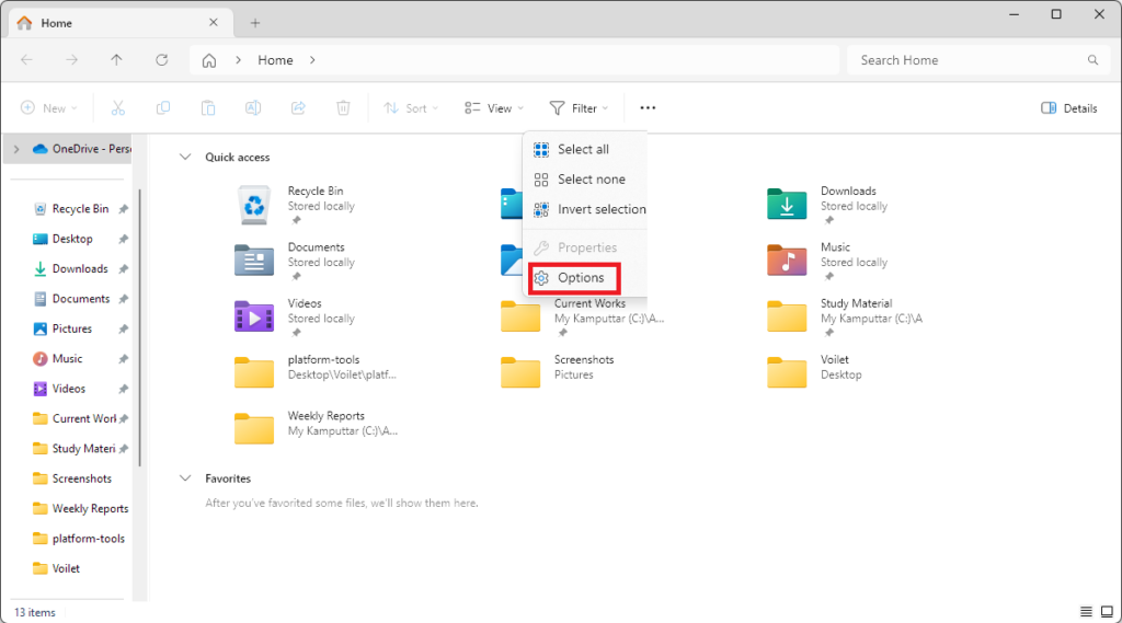3.Klicka påAlternativför att öppna mappalternativ.