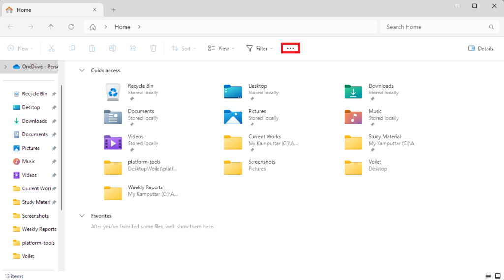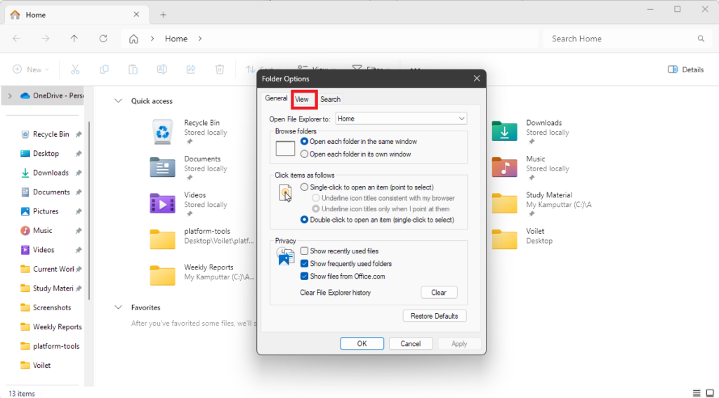Ett annat sätt att visa dolda filer i File Explorer-appen är från mappalternativen. Följ dessa steg för att aktivera synligheten för dolda filer med hjälp av mappalternativen i Windows 11: