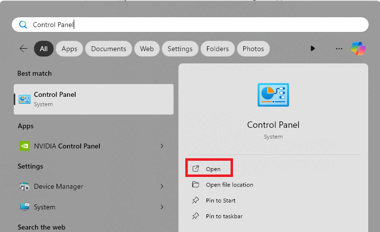 1.Öppna appen Kontrollpanel. Du kan göra det genom att söka efter appen i Start-menyn.