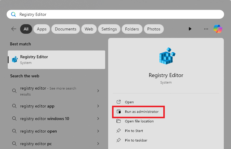 1.Öppna Registereditorn med administrativa behörigheter. Du kan göra det genom att söka efter Registereditorn i Start-menyns sökfält och starta den med hjälp avKör som administratöralternativ.