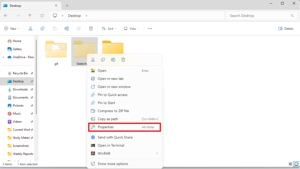 3.Högerklicka på den dolda mappen eller filen och välj egenskaper. Du kan också komma in i mappens eller filens egendom genom att trycka påAlla+Skriva infrån ditt tangentbord efter att ha valt mappen/filen.