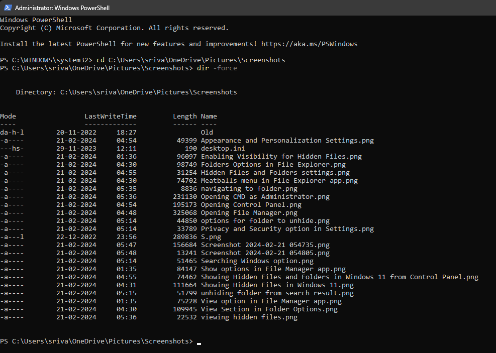 Om du gillar kommandoradsmetoder, här är en annan. Denna metod innebär att du använder Windows PowerShell, en kraftfullare och mer resursstark version av kommandotolken. Följ dessa steg för att visa dolda filer med Windows PowerShell i Windows 11: