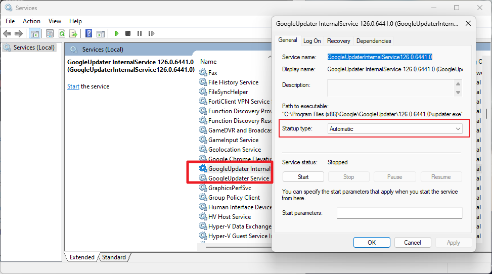 - Dubbelklicka på valfri GoogleUpdater-tjänst och upprepa följande steg: