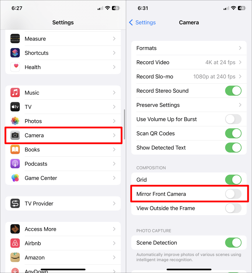 Följ stegen nedan för att få din iPhone eller iPad att spara selfies som de visas i kameraförhandsgranskningen.
