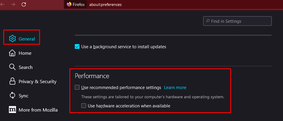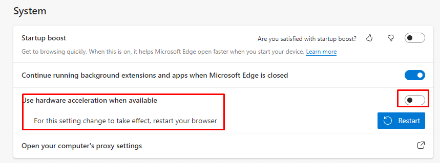- VäljaSystempå den vänstra sidofältsmenyn och inaktiveraAnvänd hårdvaruacceleration när tillgängligalternativ.