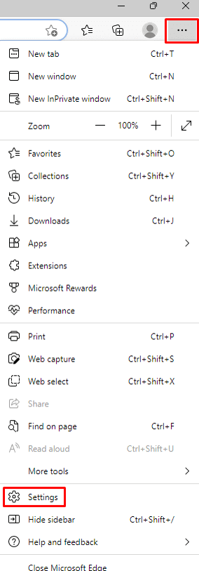 - Öppna Microsoft Edge och klicka på ikonen med tre punkter. VäljaInställningarfrån rullgardinsmenyn.