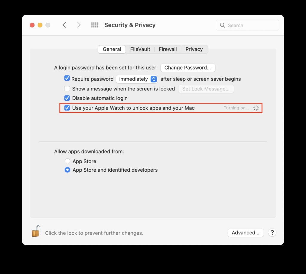 4.Aktiveraväxeln bredvidAnvänd Apple Watch för att låsa upp appar och din MacunderAllmänflik.