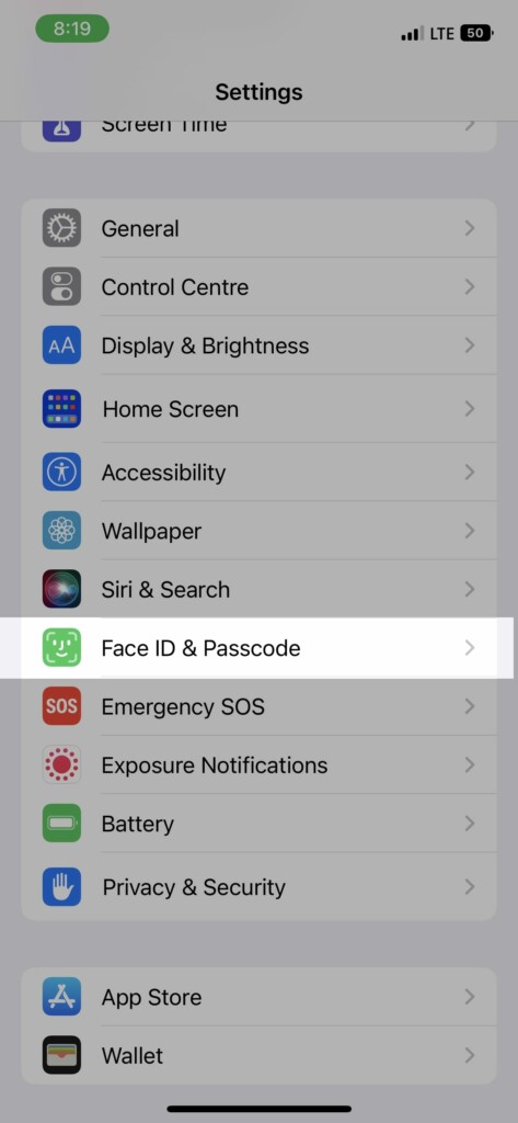 2.Rulla ned och tryck påFaceID och lösenord. Ange dinLösenordnär du uppmanas.