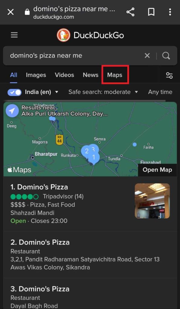 Varje webbläsare visar rutter såväl som andra platsbaserade sökningar med sin inbyggda kartmotor. För att komma åt Apple-kartor på Android och Windows användDuckDuckGo,den bästa integritetsfokuserade sökmotorn.För att bevara sin integritetsstatus använder DuckDuckGo Apple Maps som sin inbyggda kartmotor.