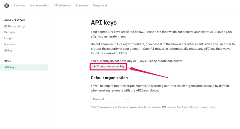 Notera:Denna API-nyckel kommer endast att vara synlig i ditt OpenAI-konto en gång. Om du tappar bort den här nyckeln måste den återskapas.