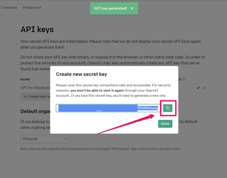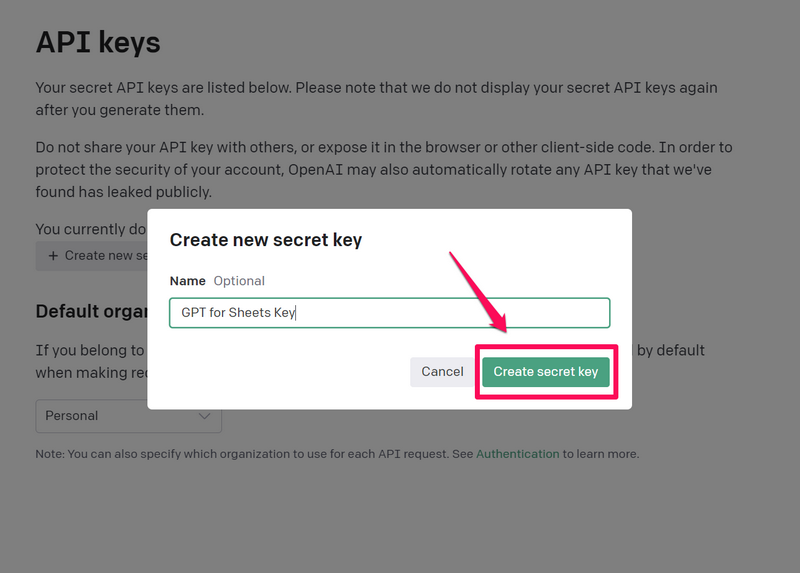 4.Nu kommer OpenAI att generera en ny hemlig API-nyckel som du kan använda.