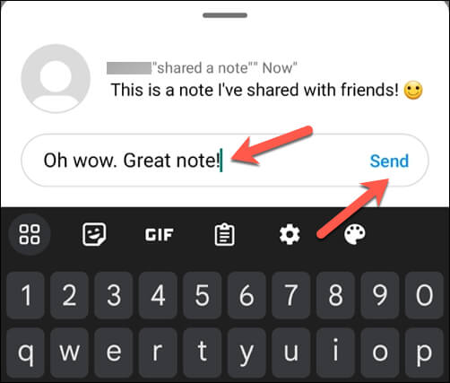 - Skriv ditt meddelande i rutan och tryckSkicka för att svara på en anteckning.Ditt svar kommer att visas som en vanlig oläst chatt i din inkorg för direktmeddelanden. Du kan också skicka foton, videor, klistermärken, GIF-filer eller röstmeddelanden som svar.