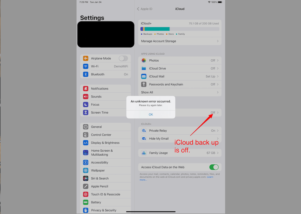Om jag försöker aktivera Synkronisera denna iPad i iCloud Drive-inställningen får jag samma okända fel.