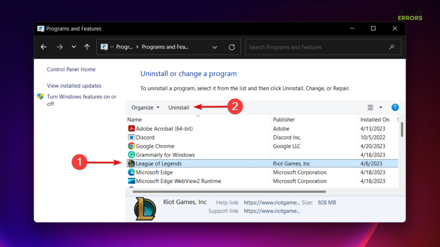 - Leta upp och klicka påMinecrafti listan över installerade appar, klicka sedan på knappen Avinstallera, precis som vi visar dig med LoL-exemplet i bilden nedan.