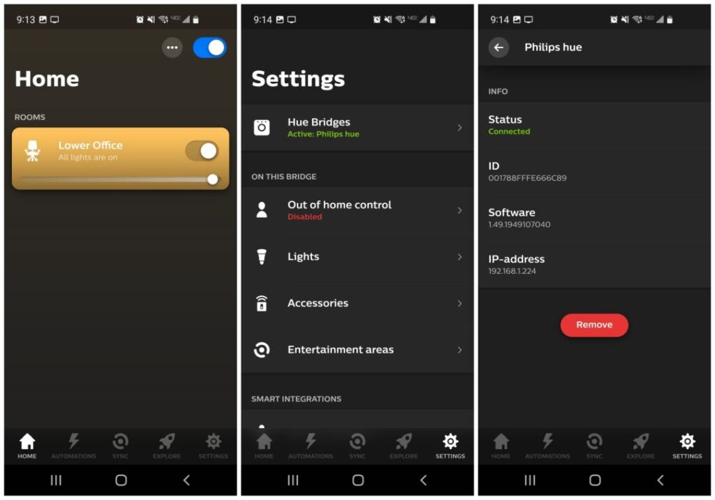 Om du har bekräftat att allt är korrekt kopplat är nästa sak att kontrollera att Philips Hue-bryggan är korrekt ansluten till nätverket genom att kontrollera anslutningsstatusen i Philips Hue-appen.