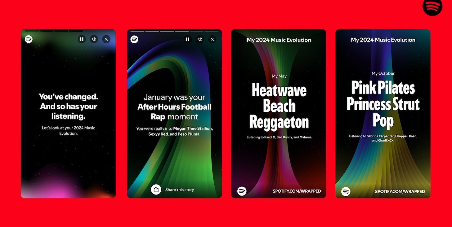 En av de framstående funktionerna i 2024 Wrapped är avsnittet Music Evolution. Den här funktionen visar hur din musiksmak har utvecklats under det senaste året. Den visar din resa från de genrer du började med i början av året till de nya stilar och artister du upptäckte längs vägen.