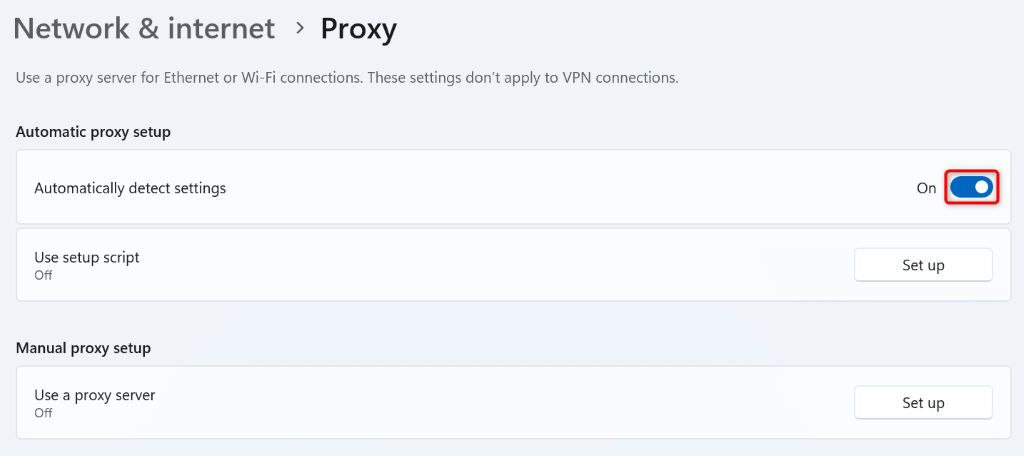 - VäljaInrättabredvidAnvänd en proxyserveroch stäng avAnvänd en proxyserver.
