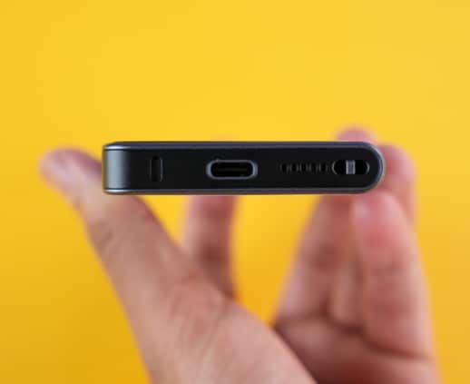 Två högtalare pryder också översättarens sidor. Den andra sidan av översättaren bär volymreglaget och nano-SIM-facket. USB-C-laddningspunkten är längst ner, tillsammans med hålet för snodd och en högtalare.