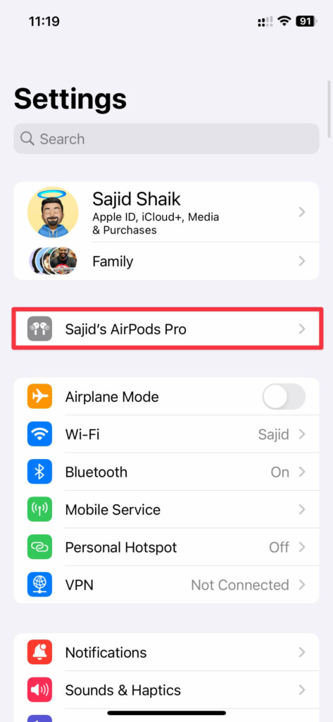 4.Välj dinAirPods namnunder Apple ID-inställningar.