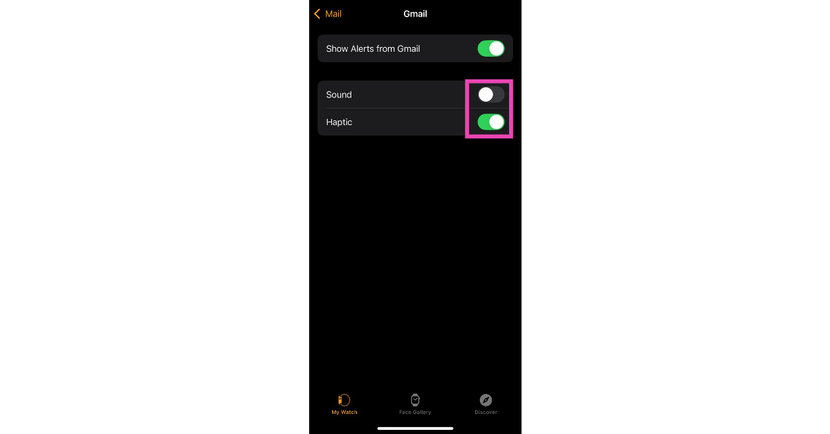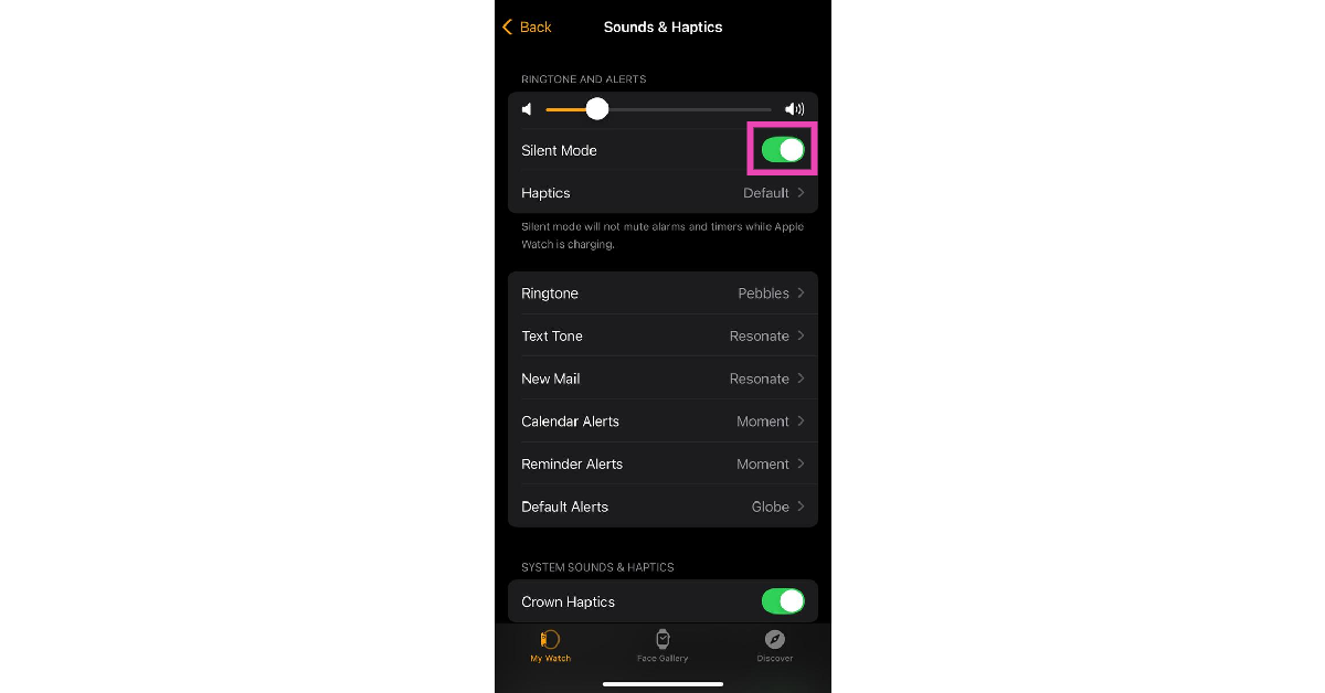 Om du inte vill ha några ljudvarningar för din Apple Watch, gå tillInställningar>Ljud & Haptics och slå på vippknappen för tyst läge. Detta kommer inte att stänga av haptiska varningar.