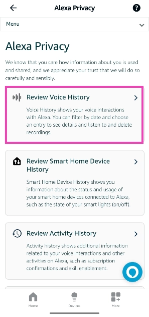 Starta Amazon Alexa-appen och gå tillMer>Alexa Privacy>Granska rösthistorik.