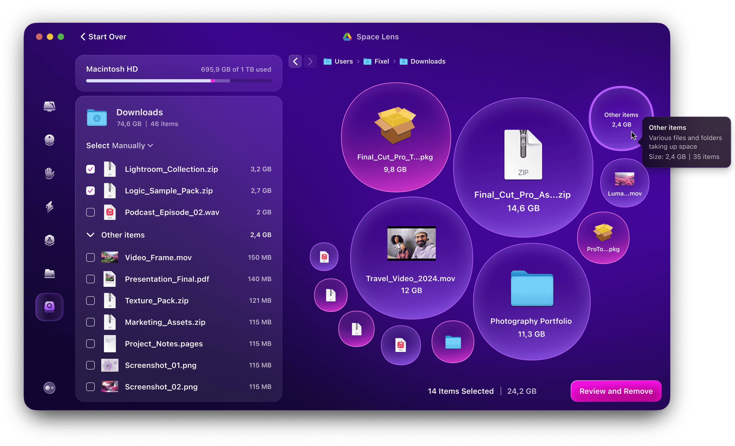 Space Lens tar samma visuella koncept och utvecklar det. Layouten är interaktiv och snygg och känns integrerad i ett bredare saneringsflöde. Det visar dig inte bara vart rymden tar vägen; den belyser vad som är säkert att ta bort, vad som är gammalt och vad som har glömts bort i dolda hörn av din enhet.