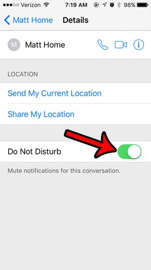 Möjligheten att alltid vara ett telefonsamtal eller sms borta är en av mobilkulturens största tilltal, men du kanske inte vill att dina affärskontakter ska ha tillgång till dig dygnet runt. Om det börjar bli sent och någon bara inte slutar skicka textmeddelanden till dig, kan det ge dig lite lugn och ro genom att stänga av aviseringarna för den konversationen. Du kan stänga av en konversation genom att öppna den iMeddelandenappen genom att trycka påDetaljerknappen och sedan aktiveraStör ejalternativ.