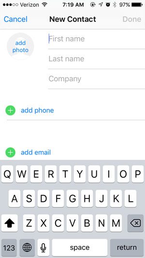 Du kommer alltid att interagera med nya människor eller få nya kunder, men att söka genom e-postmeddelanden eller textmeddelanden efter ett telefonnummer eller en e-postadress kan vara ineffektivt. När du har den informationen kan du skapa en ny kontakt och koppla den e-postadressen eller telefonnumret till den kontakten. Skapa en ny kontakt genom att öppnaKontakterappen genom att trycka på+knappen i det övre högra hörnet av skärmen och fyll sedan i den information du har.