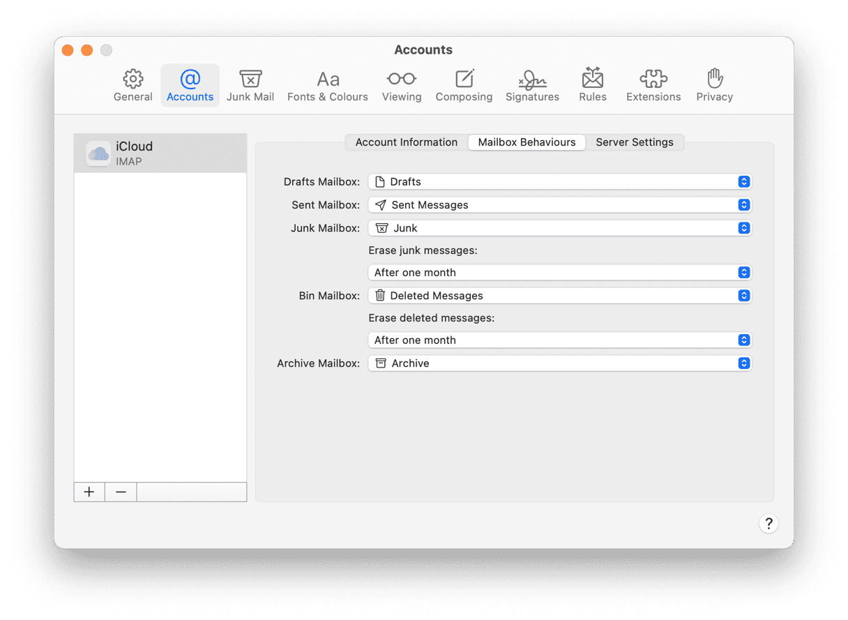Gå till Mail > Inställningar > Konton och klicka på ett konto. Välj Postlådebeteende. Klicka på menyn under "Radera skräpmeddelanden:" och välj ett alternativ. Gör samma sak med menyn under "Radera borttagna meddelanden".