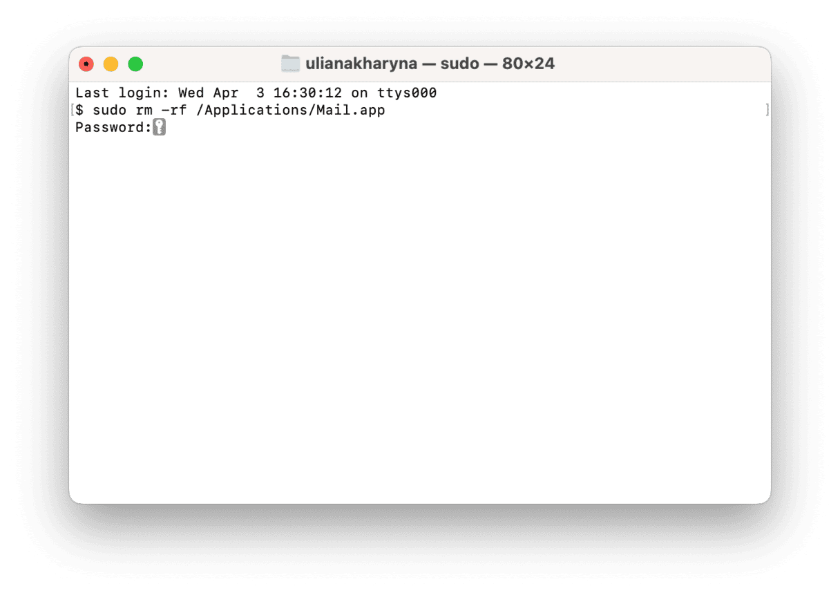 sudo rm -rf /Applications/Mail.app– detta kommando tar bort Mail-appen. - Tryck på Retur.