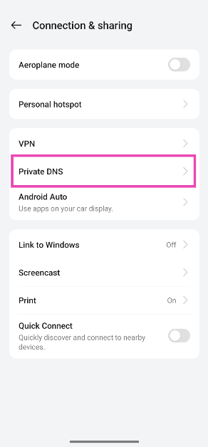 Steg 2:Tryck påPrivat DNS.