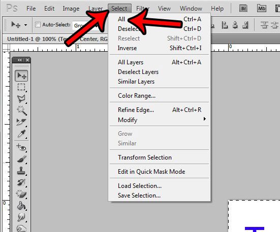 Steg 3: Välj hela lagret genom att trycka påCtrl + Apå ditt tangentbord eller genom att klickaVäljasedanAllahögst upp i fönstret.