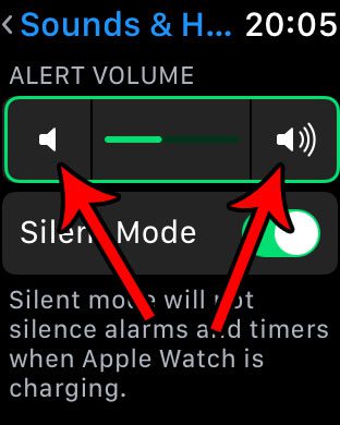 Steg 3: Sänk varningsvolymen genom att trycka på knappen till vänster om volymfältet, eller öka varningsvolymen genom att trycka på knappen till höger om volymfältet. Du kan också justera varningsvolymen för Apple Watch på den här skärmen genom att trycka på en av volymknapparna och sedan vrida på kronan.