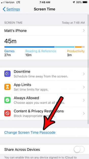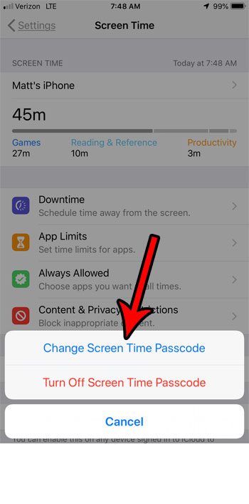 Vår artikel fortsätter nedan med ytterligare information om hur du ändrar lösenordet för iPhone-skärmtid, inklusive bilder på dessa steg.