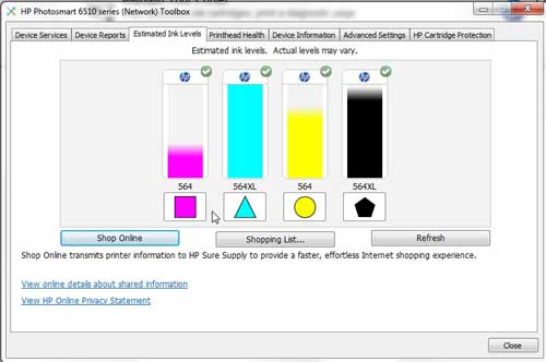 Steg 5: Bilden nedan är förUppskattade bläcknivåerfliken för Photosmart 6510 Toolbox. Om du klickar på någon av de andra flikarna i det här fönstret kan du få ytterligare information om din skrivare.