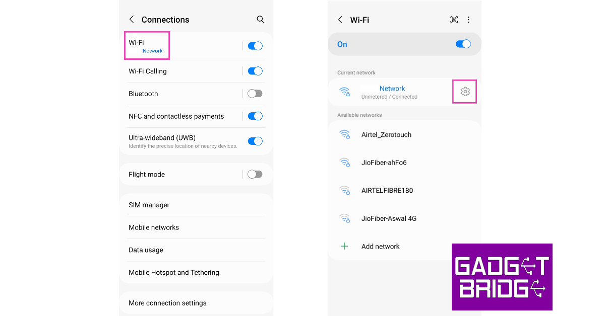 Steg 2:Tryck på WiFi och tryck sedan på kugghjulsikonen bredvid ditt WiFi-nätverk.