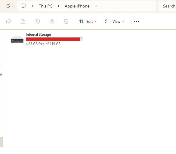 - Navigera till din iPhone: I det vänstra sidofältet i File Explorer bör du se din iPhone listad under "Den här datorn." Klicka på den för att komma åt din iPhones lagring.