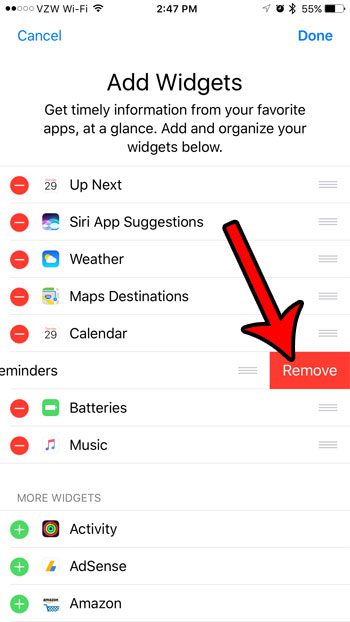 Steg 5: Tryck på den rödaTa bortknappen till höger om widgeten för att ta bort den widgeten från din iPhone.