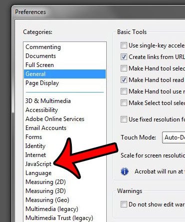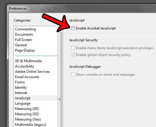 Steg 4: Klicka på rutan till vänster omAktivera Acrobat Javascriptför att ta bort bocken och stänga av den. Du kan sedan klicka påOKknappen längst ned i fönstret för att tillämpa dina ändringar.