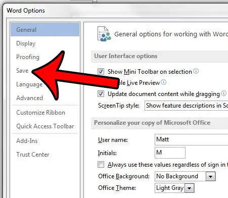 Steg 4: Klicka påSparafliken i den vänstra kolumnen iOrdalternativfönster.