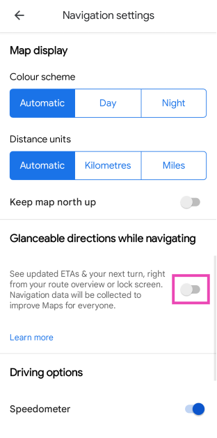 Starta Google Maps, gå tillInställningar>Navigeringsinställning, och slå på vippomkopplaren för "Öppbara vägbeskrivningar under körning".
