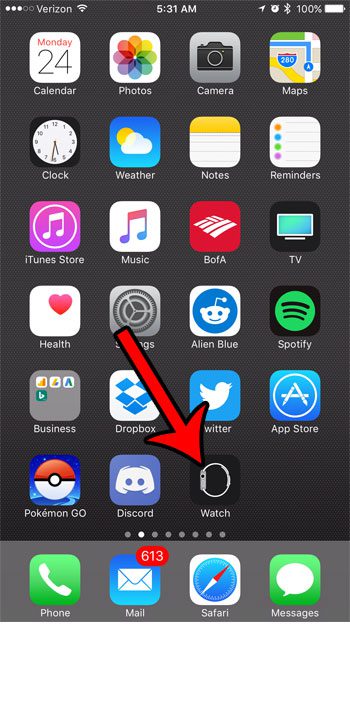 Stegen i den här artikeln utfördes på en iPhone 7 Plus i iOS 10.3.1. Den här guiden kommer inte att inaktivera pulsmätaren på din Apple Watch helt. Det kommer bara att stoppa övervakningen som sker när du gör ett promenad- eller löppass. Den specifika funktionen hos klockan använder en avsevärd del av ditt batteri, så att aktivera det här alternativet är tänkt att få ditt klockbatteri att hålla lite längre mellan laddningarna.