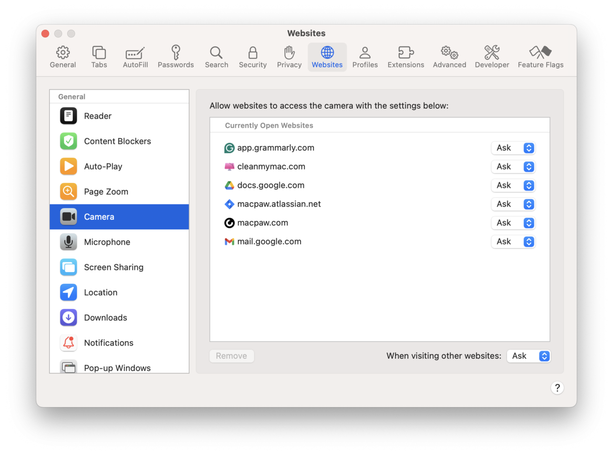 Här är ett annat alternativ för dig att kolla in - gå till webbläsarinställningar och dubbelkolla om några webbplatser kan komma åt din kamera. Följ dessa steg för din webbläsare: